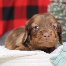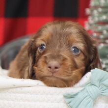 I’m Carson! I’m a 5-week-old male Dachshund with a beautiful chocolate dapple coat, born on October 30, which makes me a Scorpio sign. I’ll be ready to go home to my forever family after December 25, once I’m grown enough to leave my litter. I’m AKC registered. I’ll bring the love, you bring the treats.